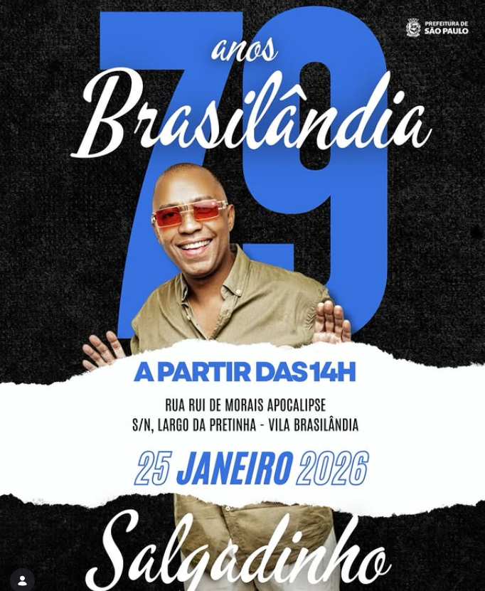 A Subprefeitura da Freguesia/Brasilândia anunciou show neste domingo para comemorar os 79 anos da Brasilândia. Haverá uma festa especial com show do Salgadinho que é um cantor e compositor de samba, especialmente da vertente do pagode.