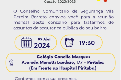 Publicado em 05/04, às 12h55 por Redação A reunião de abril do Conselho Comunitário de Segurança Vila Pereira Barreto já tem data marcada para acontecer. O...