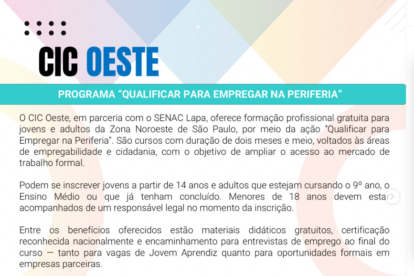 Publicada em 15/10/2025 às 11h15 Por Redação O Centro de Integração da Cidadania (CIC) Oeste promove a ação “Qualificar para Empregar na Periferia”...