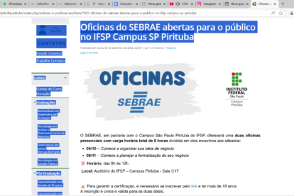 Publicada em 17/9/2024 às 10h45 Por Redação O Instituto Federal de Educação de Pirituba juntamente com o Sebrae oferece oficinas do SEBRAE abertas para o...