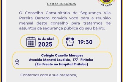 Publicada em 14/4/2025 às 9h30 Por Redação O Conselho Comunitário de Segurança Vila Pereira Barreto (Conseg), realiza na quarta, 16 de abril, a terceira...