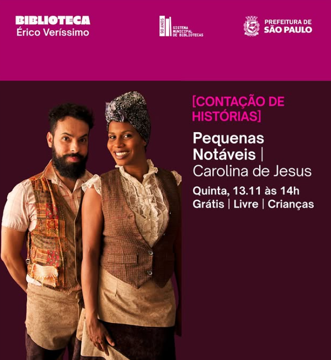 Para o Mês da Consciência Negra, a Prefeitura de São Paulo preparou uma programação gratuita, variada e cheia de representatividade nos centros culturais e bibliotecas da cidade. Nesta quinta, 13, a biblioteca Erico Verissimo, em Parada de Taipas, apresentará, às 14h,a contação de histórias “Pequenas Notáveis: Carolina de Jesus”, da Cia. Núcleo. A atividade relembra a infância da escritora e sua trajetória como uma das vozes mais importantes da literatura negra brasileira. Toda grande personalidade um dia já foi criança, e é neste período da vida que a Cia. Núcleo aborda no ciclo de contações Pequenas Notáveis. Carolina de Jesus é uma das cinco mulheres escolhidas para representar esta pesquisa sobre o feminino, a identidade de gênero e os papéis sociais.Enquanto trabalhava como catadora, Carolina Maria de Jesus registrava o cotidiano da favela do Canindé em cadernos que encontrava no lixo, e depois se tornou uma das principais escritoras negras do Brasil. Rua Diógenes Dourado, 101.