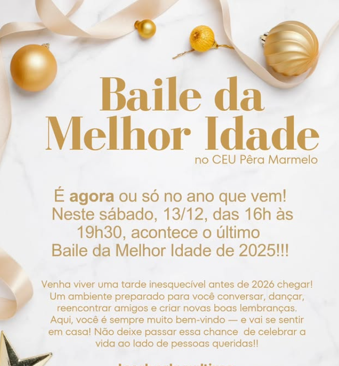Logo mais à noite, ocorrerá o último Baile da Melhor Idade, das 16h às 19h30, na sala multiuso