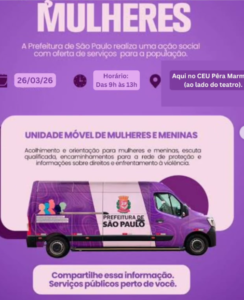 O CEU Pêra Marmelo recebe hoje unidade móvel para acolhimento e orientação sobre direito e prevenção a violência contra mulheres e meninas. A Van é uma Unidade Móvel de Atendimento às Mulheres que amplia a rede de proteção na cidade de São Paulo. Trata-se de um equipamento descentralizado e itinerante que percorre diferentes territórios, garantindo o acesso aos serviços da rede de enfrentamento à violência contra a mulher. O atendimento é até às 13h. O CEU Pêra Marmelo fica na rua Pêra Marmelo, 226, no Jaraguá.