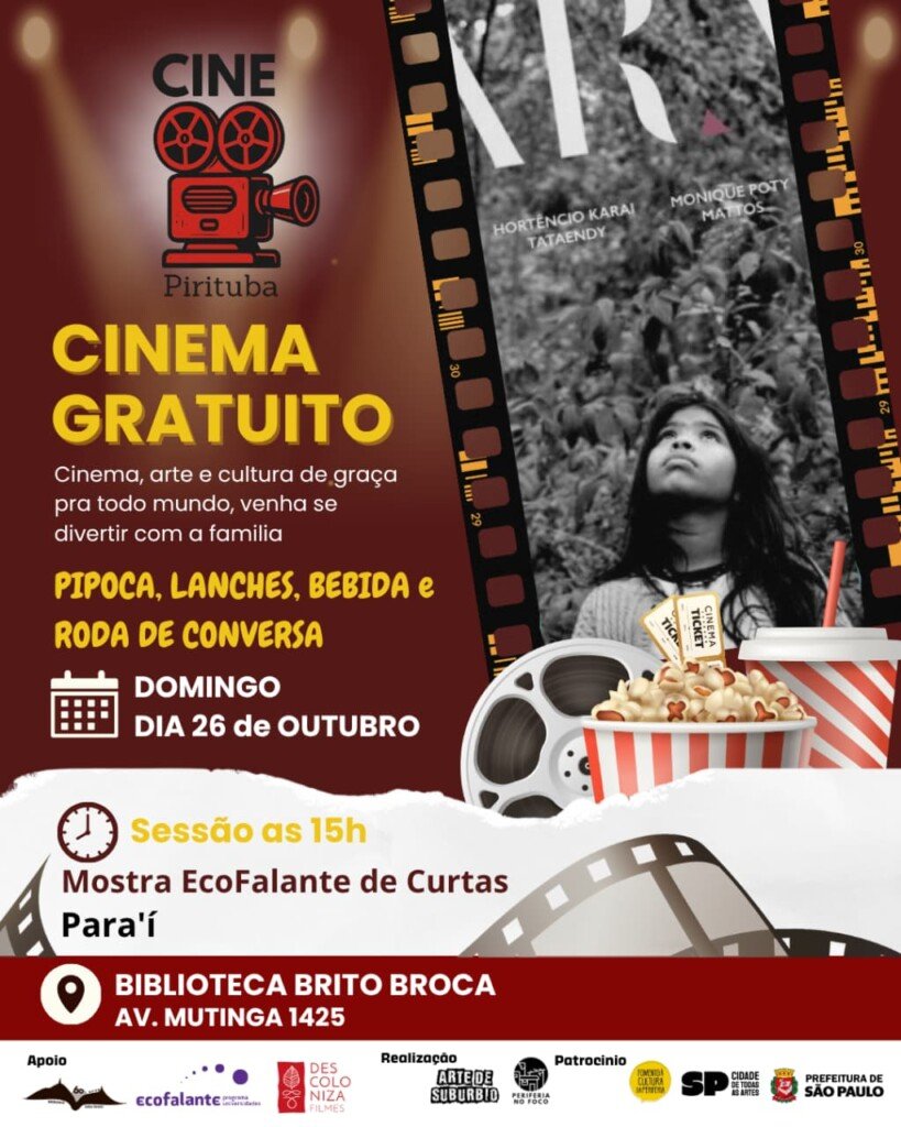 Uma programação potente, feita com afeto, para fortalecer a cultura. Assim pode ser definido o ‘Projeto Arte de Subúrbio’ sobre arte periférica que traz diversas atividades este mês na Biblioteca Brito Broca, na Avenida Mutinga, 1425. No próximo dia 26, domingo, das 15h e 16h, haverá a exibição do filme Para’i que integra a Mostra Ecofalante de curtas metragens.