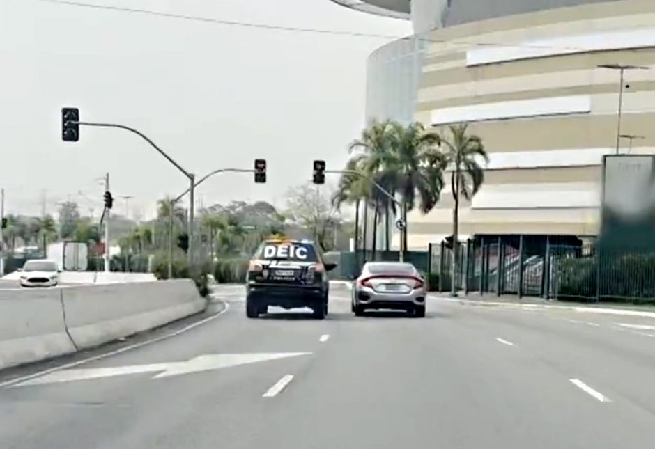 Durante a perseguição, o homem chegou a entrar pela contramão na área de acesso de um shopping local, circulando em alta velocidade pela garagem até voltou para a avenida. Na reportagem, o delegado Miguel Ferreira da Silva conta que os agentes da Polícia Civil, percebendo que o golpista continuaria a fugir, buscaram alternativas para tirá-lo da pista, pois ele poderia atropelar alguém. Na sequência, uma das viaturas se aproxima e toca o veículo, fazendo com que o motorista perca o controle. O carro então derrapa, acerta outros dois veículos e colide com uma árvore. “Foram sete minutos aproximadamente de perseguição”, destaca o delegado da Polícia Civil. Após a colisão, o golpista finalmente foi detido e encaminhado à delegacia. Ninguém se feriu.