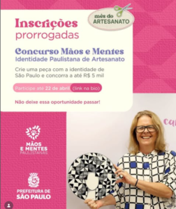 A Prefeitura de São Paulo prorrogou até o dia 22 de abril as inscrições para a 3ª edição do Concurso “Mãos e Mentes – Identidade Paulistana de Artesanato”. A iniciativa é voltada a artesãos e manualistas credenciados no programa Mãos e Mentes Paulistanas e vai premiar até 20 participantes com um total de R$100 mil. Clique aqui para se inscrever.