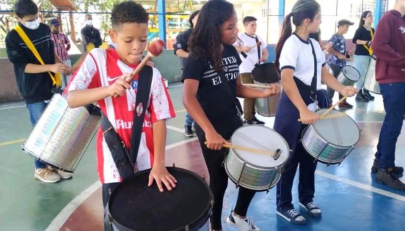 Inicialmente, os alunos têm contato com todos os instrumentos que compõem uma bateria. Na sequência, eles conhecem a função de cada um deles e, diante da experimentação, podem escolher o seu favorito – o que mais gostou ou se adaptou melhor. A partir daí, o aluno cai na batucada e poderá tocar nas apresentações do projeto, que conta também com o apoio da gestão da escola.