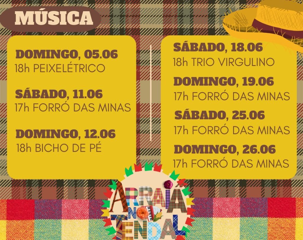 A festança no Tendal da Lapa (R. Guaicurus, 1100) ocorrerá nos dias 5, 11, 12, 18, 19, 25 e 25/06, sempre das 14h às 20h. Serão dias recheados de música boa, comida e brincadeiras. Já no próximo domingo, 5 de junho, a partir das 18h, o arraiá ficará por conta da banda Peixelétrico, que sobe ao palco do Tendal para apresentar seu quarto álbum – Peixelétrico +AMOR. No repertório, além dos hits banda, serão apresentadas releituras de clássicos do Forró e da MPB. Imperdível!