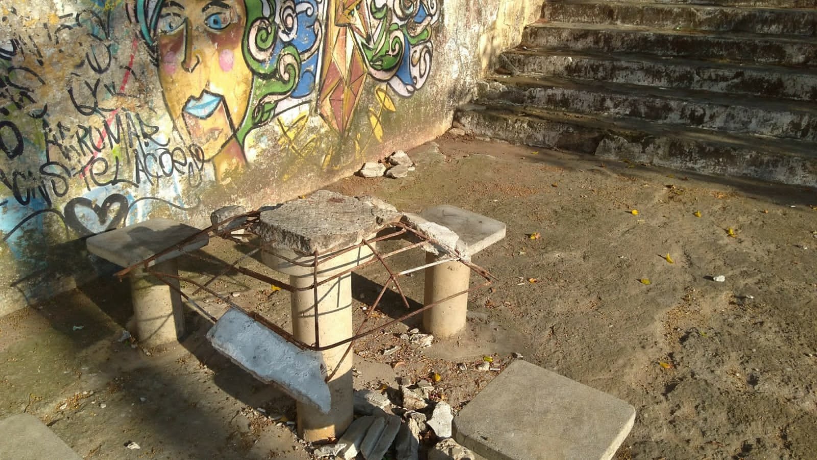A Praça 25 de Novembro, na Vila Zatt, está abandonada. Mato e lixo tomam conta do local e, para piorar, vândalos quebraram uma mesa de alvenaria – e os ferros ficaram aparentes, podendo causar acidentes graves como furar os olhos dos pequenos. Pedimos socorro!
