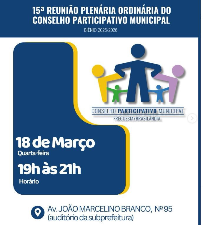 O Conselho Participativo Municipal (CPM)  da Subprefeitura Freguesia/Brasilândia convida todos os membros e a comunidade para a próxima Reunião Ordinária, que ocorrerá na quarta-feira, 18,, às 19h, no auditório da Subprefeitura, localizado na Avenida João Marcelino Branco, 95.