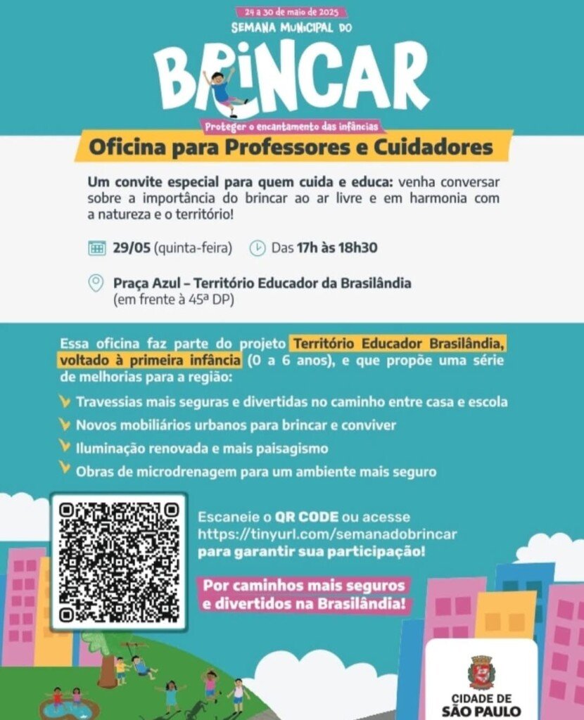 Serão duas oficinas, para crianças e para professores e cuidadores. A programação inclui brincadeiras tradicionais, oficinas criativas, contação de histórias, gincanas e muito mais, tudo pensado para fortalecer vínculos afetivos e promover a convivência entre crianças, famílias e educadores. A primeira ocorrerá das 14h30 às 16h na Praça azul, Território Educador da Brasilândia ( em frente à 45 DP), voltada à primeira infância ( 0 a 6 anos) , e que propõe uma série de melhorias para a região. Já a segunda oficina ocorrerá no mesmo local, das 17h às 18h30, direcionada a professores e cuidadores. A Semana do Brincar é um convite para educadores, gestores, famílias e cidadãos, a proteger e valorizar o encantamento da infância.