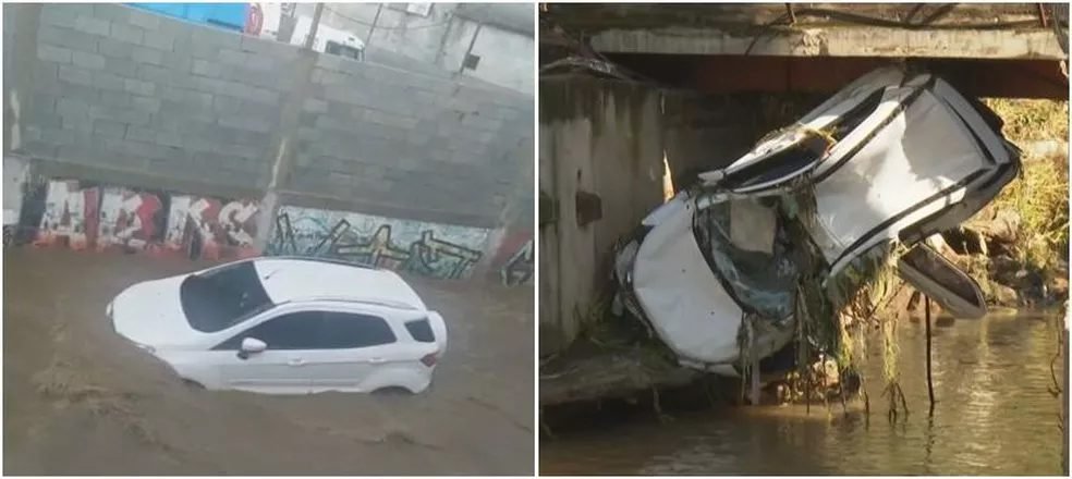 Um carro ficou pendurado após cair em um córrego em Perus durante a forte chuva que atingiu a cidade na última quarta-feira. O veículo estava estacionado na Rua Antonieta Maia e foi arrastado pela enchente. A rua ficou alagada após o córrego transbordar. A dona do carro tinha ido ao cartório. O veículo acabou preso na estrutura de concreto.