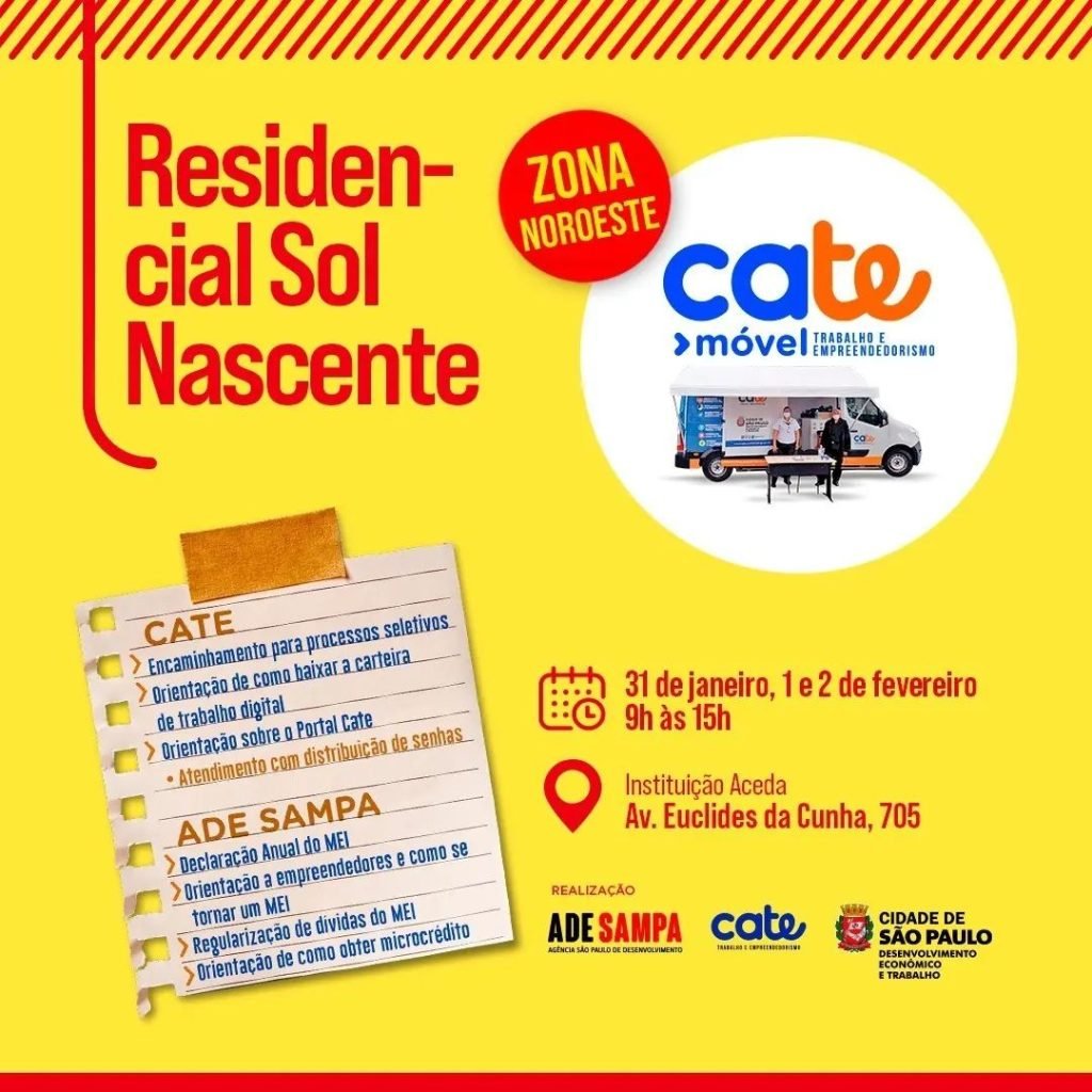 O Residencial Sol Nascente, na região do Jaraguá, recebe a partir desta terça-feira, 31 de janeiro, a visita do Cate Móvel. O atendimento, que acontece na Avenida Euclides da Cunha, 705, até a próxima quinta, 2 de fevereiro, será focado em serviços de empregabilidade, que incluem encaminhamento para vagas de emprego, orientações sobre emissão da carteira de trabalho digital, mercado de trabalho e adesão ao MEI, além de atendimento voltado aos microempreendedores individuais, que poderão realizar a declaração anual e regularizar suas dívidas. Analistas da Ade Sampa também estarão presentes para auxiliar a população. O horário de atendimento do Cate Móvel é sempre das 9h às 15h.