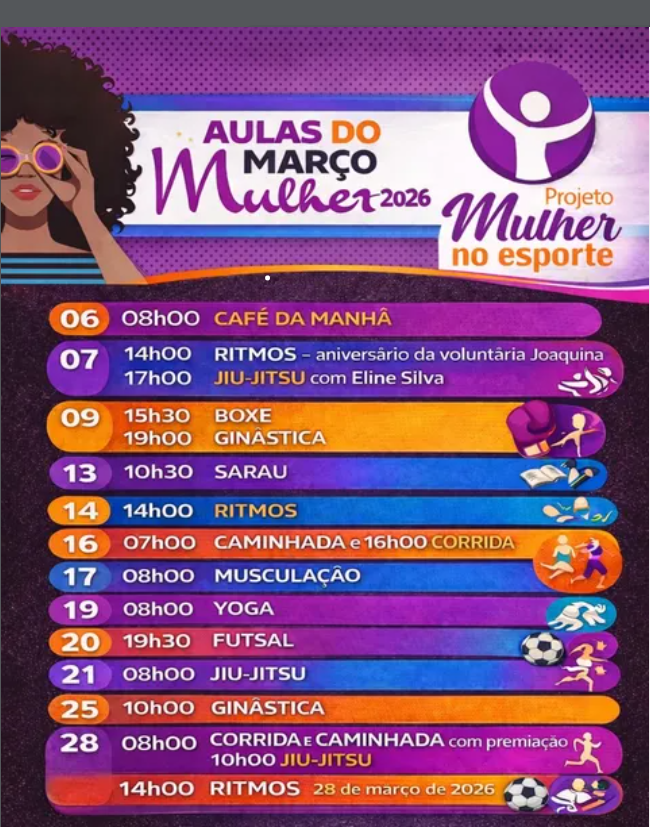 Serão aulas e vivências como ritmos, caminhada, corrida, yoga, musculação, ginástica, jiu-jitsu, futsal, boxe e sarau. Promovendo saúde, bem-estar, movimento e valorização das mulheres através do esporte. Inscrições gratuitas no CEU fica na Rua Pedro José de Lima, 1020 – Anhanguera.