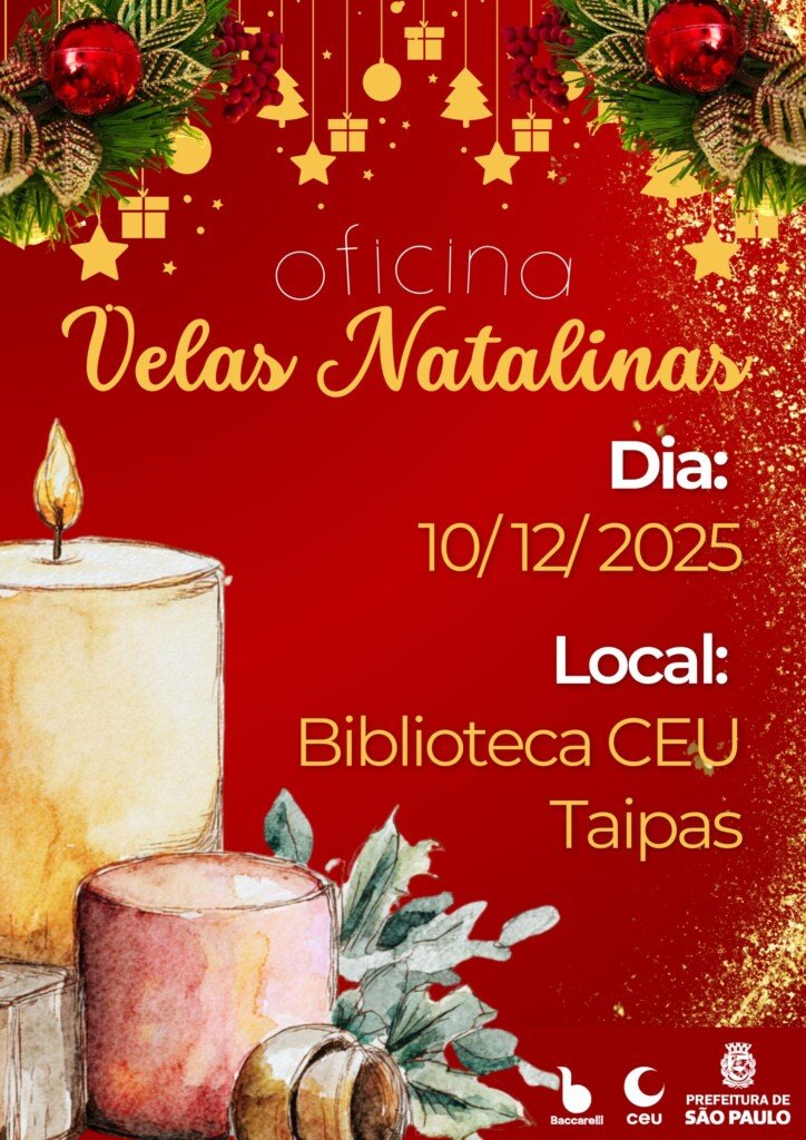 A Biblioteca do CEU Taipas convida a comunidade para participar da Oficina de Velas de EVA Natalinas, uma atividade prática e criativa que celebrará o espírito do Natal, nesta quarta, dia 10, das 9h às 11h.