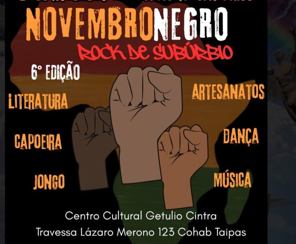 Além dessas atrações, o evento contará com intervenção de literatura e poesia, exposição de artesanatos e brechó. A 6° edição do ‘Novembro Negro’ vai acontecer no Pólo Cultural Getulio Cintra, que fica na Travessa Lázaro Merono n° 123 na COHAB Taipas, das 14 horas às 22 horas. Entrada livre.