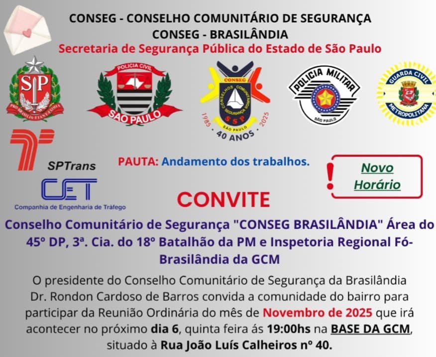O Conselho Comunitário de Segurança ( Conseg) Brasilândia realiza reunião mensal hoje, dia 6, às 19h, na base da GCM, na rua João Luis Calheiros, 40, e convida a população para participar e levar as suas demandas.