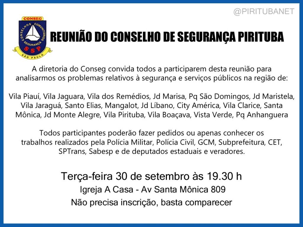 A reunião mensal do Conselho Comunitário de Segurança (Conseg) Pirituba será realizada logo mais, às 19h30, para discutir e buscar soluções para os problemas de segurança pública em suas comunidades, entre outros assuntos pertinentes e demandas da população. O encontro será na Avenida Santa Mônica, 809. A entrada é livre.