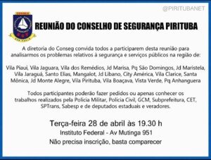 O convite é para que os moradores participem da segurança dos bairros e levem suas críticas e sugestões aos órgãos competentes presentes no encontro. Entrada livre. Não precisa inscrição, basta comparecer.