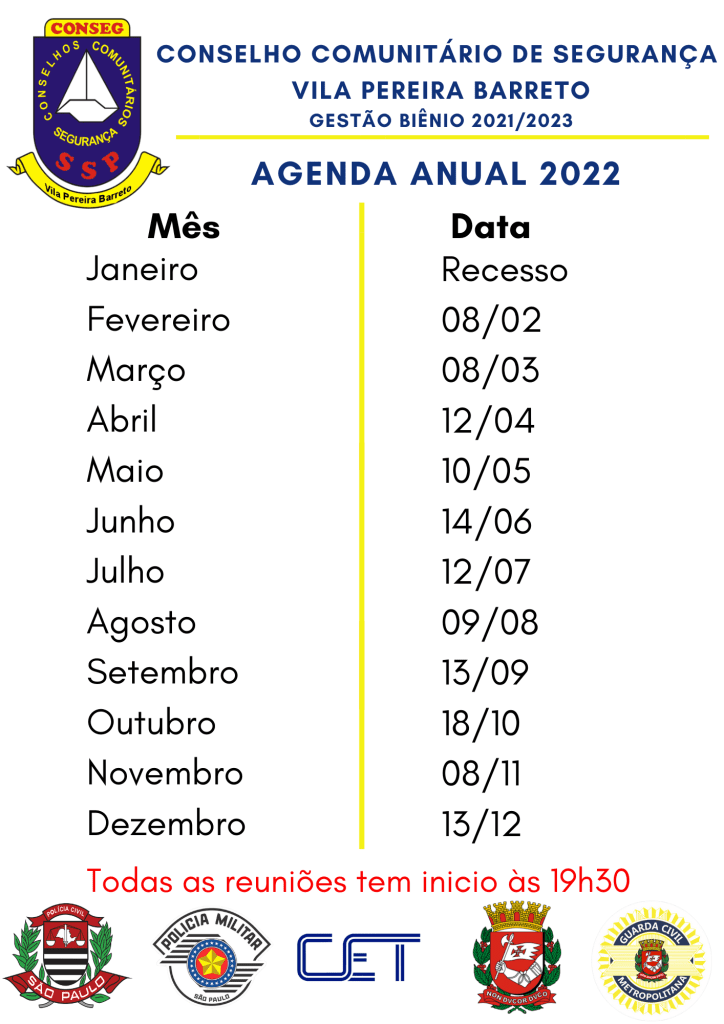 O Conseg (Conselho Comunitário de Segurança) Vila Pereira Barreto realiza nesta terça-feira, 8 de fevereiro, a primeira reunião do ano. O encontro acontecerá às 19h30 no Colégio Canello Marques, localizado na Av. Menotti Laudísio, em frente ao Hospital de Pirituba.