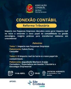 O papel da contabilidade está evoluindo — e quem se posiciona de forma estratégica gera impacto real no lucro dos seus clientes e se destaca no mercado. Neste encontro, a Distrital Noroeste da associação Comercial de São Paulo pretende abordar como o contador pode ir além das obrigações fiscais e atuar como peça-chave no crescimento das pequenas empresas. Para tanto, a entidade convidou dois palestrantes. O primeiro será Fulvio Porto, com o tema: Tema: Impacto nas Pequenas Empresas e o segundo, Joquebede Morbeck Araújo que trará o tema O impacto real no lucro e o novo papel da contabilidade. Mais estratégia, mais valor, mais resultados. Conecte-se com outros profissionais, troque experiências e amplie sua visão sobre o futuro da contabilidade