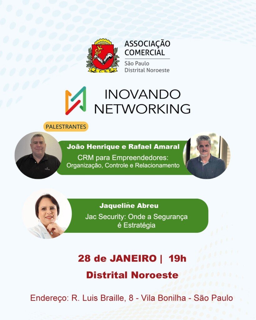A Distrital Noroeste da Associação Comercial de Paulo realiza nesta quarta, dia 28, às 19h, o IN – Inovando Networking que abre 2026 com seu primeiro evento presencial do ano, reunindo conhecimento, conexões estratégicas e troca de experiências em um encontro pensado para empreendedores e empresários da região.