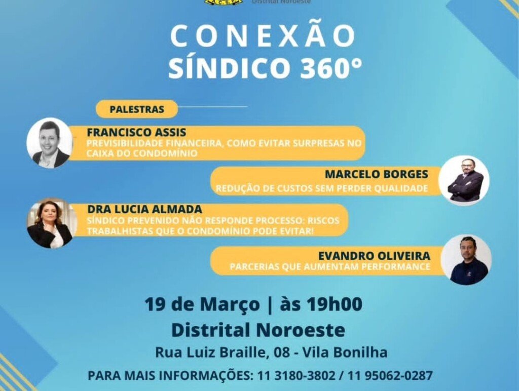 Nesta quinta, 19, às 19h, ocorrerá na Distrital Noroeste da Associação Comercial de São Paulo o evento ‘Conexão Síndico 360°’, voltado para quem atua na gestão condominial. No encontro, estão programadas as palestras: ‘Previsibilidade Financeira como evitar surpresas no Caixa do Condomínio’ por Francisco Assis; ‘Redução de custos sem perder qualidade’ por Marcelo Borges; ‘Síndico prevenido não responde processo e riscos trabalhistas que o condomínio pode evitar’ por Dra. Lúcia Almada; e ‘Parcerias que aumentam performance’ por Evandro Oliveira.