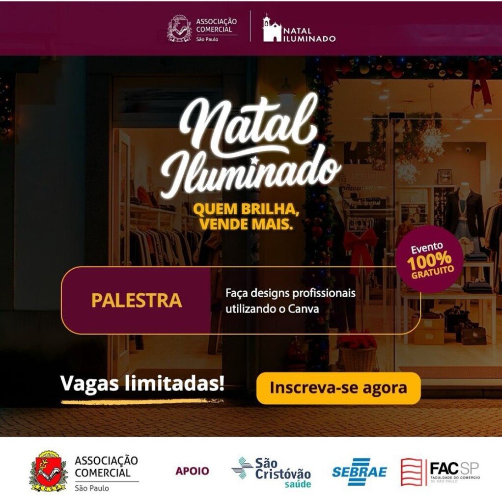 Para aproveitar todas as oportunidades que essa época do ano tem a oferecer aos negócios para garantir boas vendas, as Distritais, em parceria com o Sebrae-SP, oferecerão aos associados e demais empreendedores paulistas e paulistanos palestras gratuitas voltadas ao fortalecimento dos negócios, com foco em inovação, planejamento e marketing digital. Na Distrital Noroeste, a palestra ocorrerá hoje, 29, quarta, às 19h, com o tema: ‘Faça designs profissionais utilizando o Canva’. Rua Luís Braille, 8, Vila Bonilha. Evento gratuito. Inscrições e contato: 11 94155-3720