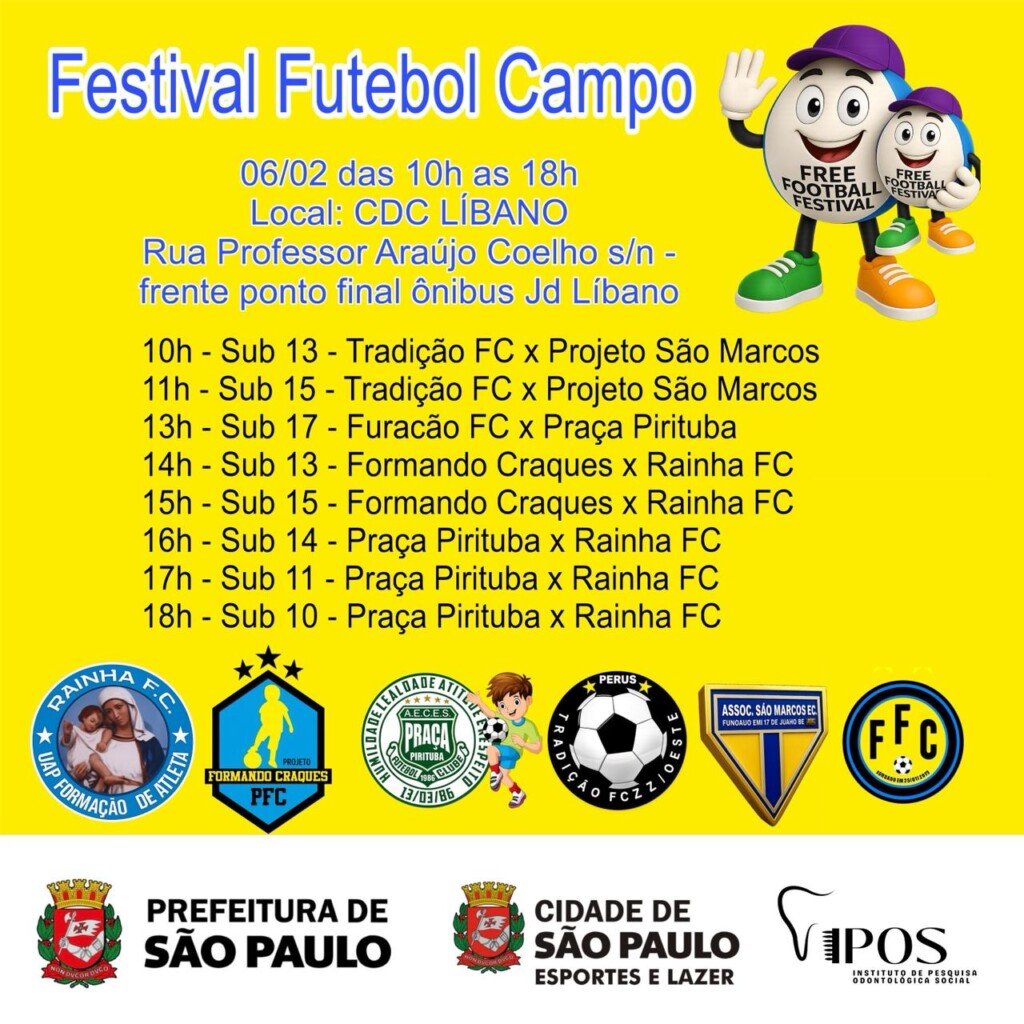 O Festival de Futebol de Campo de Crianças e Adolescentes ( Sub 10 ao 17 ) ocorrerá nesta sexta, 6, no CDC LÍBANO, com o apoio esportivo e educacional do Professor e vereador Eliseu Gabriel. Olheiros de clube que irão ver o desempenho das crianças e com possibilidades de irem para clubes profissionais. Esse festival será analisado pelos coordenadores para no futuro virar projeto e até fazer parte do calendário de eventos da Cidade de São Paulo. O Festival começa às 10h e termina às 18h na Rua Professor Araújo Coelho – Jd Líbano em Pirituba