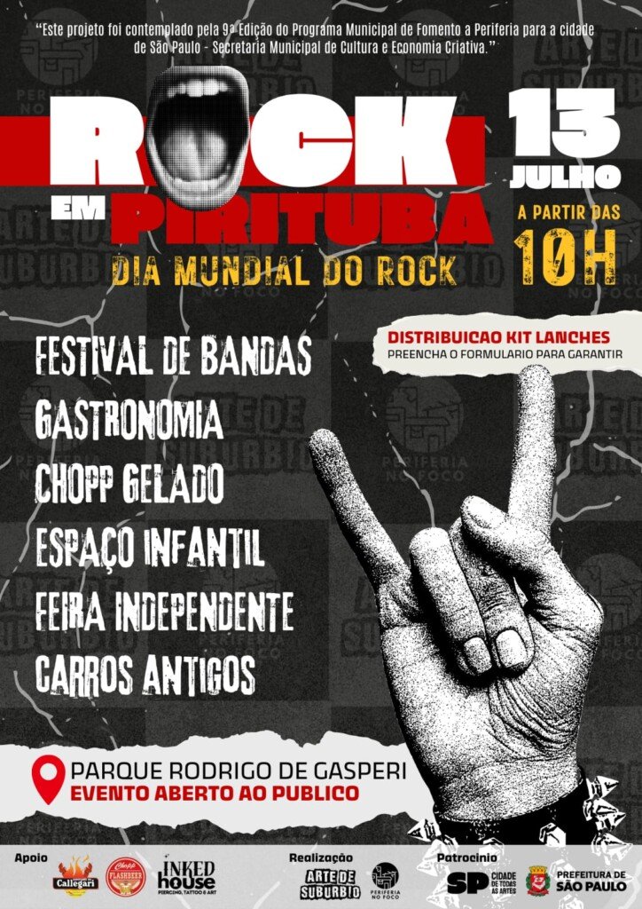 o próximo dia 13 de julho (domingo), o Parque Rodrigo de Gásperi recebe o festival ‘Rock em Pirituba’, evento gratuito que celebra o Dia Mundial do Rock com uma programação cultural potente e inclusiva.