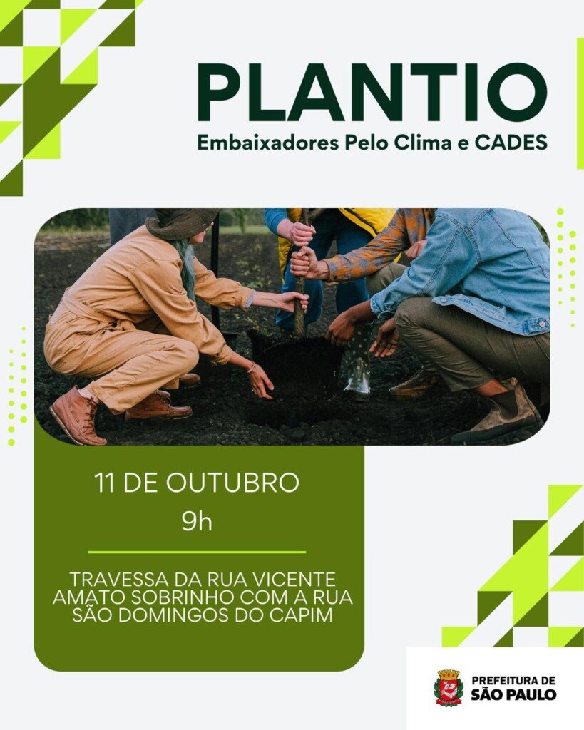 Neste sábado,11 de outubro,o CADES Pirituba (Conselho Municipal do Meio Ambiente) juntamente com a SECLIMA (Secretaria Executiva de Mudanças Climáticas), Secretaria Municipal do Verde e Meio ambiente (SVMA), Secretaria Municipal das Subprefeituras (SMSUB) e Subprefeitura de Pirituba/Jaraguá além dos Embaixadores do Clima da Prefeitura irão realizar plantio de árvores na travessa Vicente Amato Sobrinho com Rua São Domingos do Capim, no Jardim São João, no Jaraguá, às 9h.