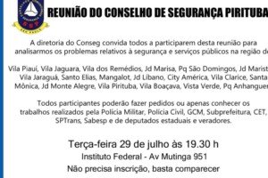 Publicada em 28/7/2025 às 9h40 Por Redação O Conselho Comunitário de Segurança de Pirituba convida a população para a reunião nesta terça, 29, a ser...