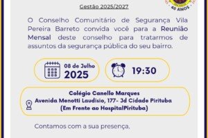 Publicada em 08/7/2025 às 9h45 Por Redação O Conselho Comunitário de Segurança Vila Pereira Barreto realiza nesta terça, 8, às 19h30, reunião para debater com...