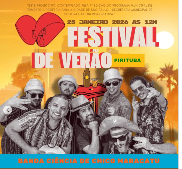 “O Festival de Verão Pirituba é um chamado para ocupar o parque, celebrar a vida e fortalecer a cultura periférica em um dia inteiro de encontros, som e alegria”, segundo os organizadores. Na programação: as bandas Soundsystem com Conexão das Rudes, Gueto Verde e Rugal —, reggae, graves que atravessam o corpo e criam conexão coletiva. Contará também com o Projeto Social Soul Samba — coletivo sócio cultural, roda de samba, afeto e resistência através da música e Banda Ciência de Chico/ Maracatu — ancestralidade, tambores, tradição e força popular para ecoar no território. (Banda Cover do Chico Science).