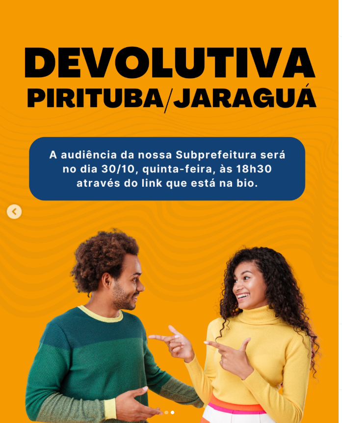 A Prefeitura de São Paulo apresenta a análise das propostas enviadas pela população para o Orçamento 2026 até o dia 6 de novembro. Será um espaço de diálogo entre a Prefeitura e os munícipes, com explicações sobre a viabilidade de cada proposta.A audiência devolutiva da Subprefeitura Pirituba/Jaraguá ocorrerá no dia 30, (quinta-feira), às 18h30. Participe pelo link: bit.ly/AudienciaPJ2025 (On-line, via Microsoft Teams)