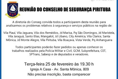 Publicada em 25/2/2025 às 9h22 Por Redação O Conselho de Segurança (Conseg) de Pirituba realiza reunião mensal nesta terça-feira, 26, na Avenida Santa Mônica...