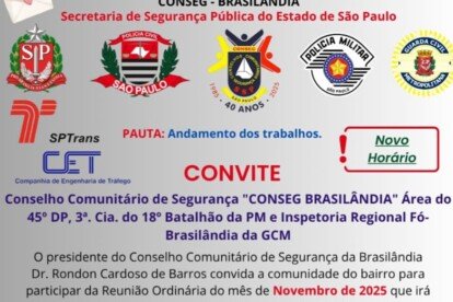 Publicada em 06/11/2025 às 9h45 Por Redação O Conselho Comunitário de Segurança ( Conseg) Brasilândia realiza reunião mensal hoje, dia 6, às 19h, na base da...