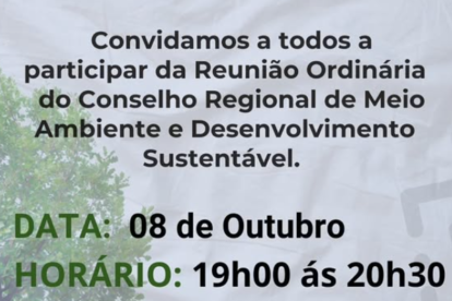 Publicada em 8/10/2025 às 9h34 Por Redação Nesta quarta, 8, das 19h00 às 20h30, ocorrerá a Reunião Ordinária do Conselho Regional de Meio Ambiente e...