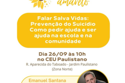 Publicada em 25/9/2025 às 10h05 Por Redação Nesta sexta, 26, às 10h, no CEU Paulistano, haverá a palestra “Prevenção do Suicídio: Como pedir ajuda e ser...